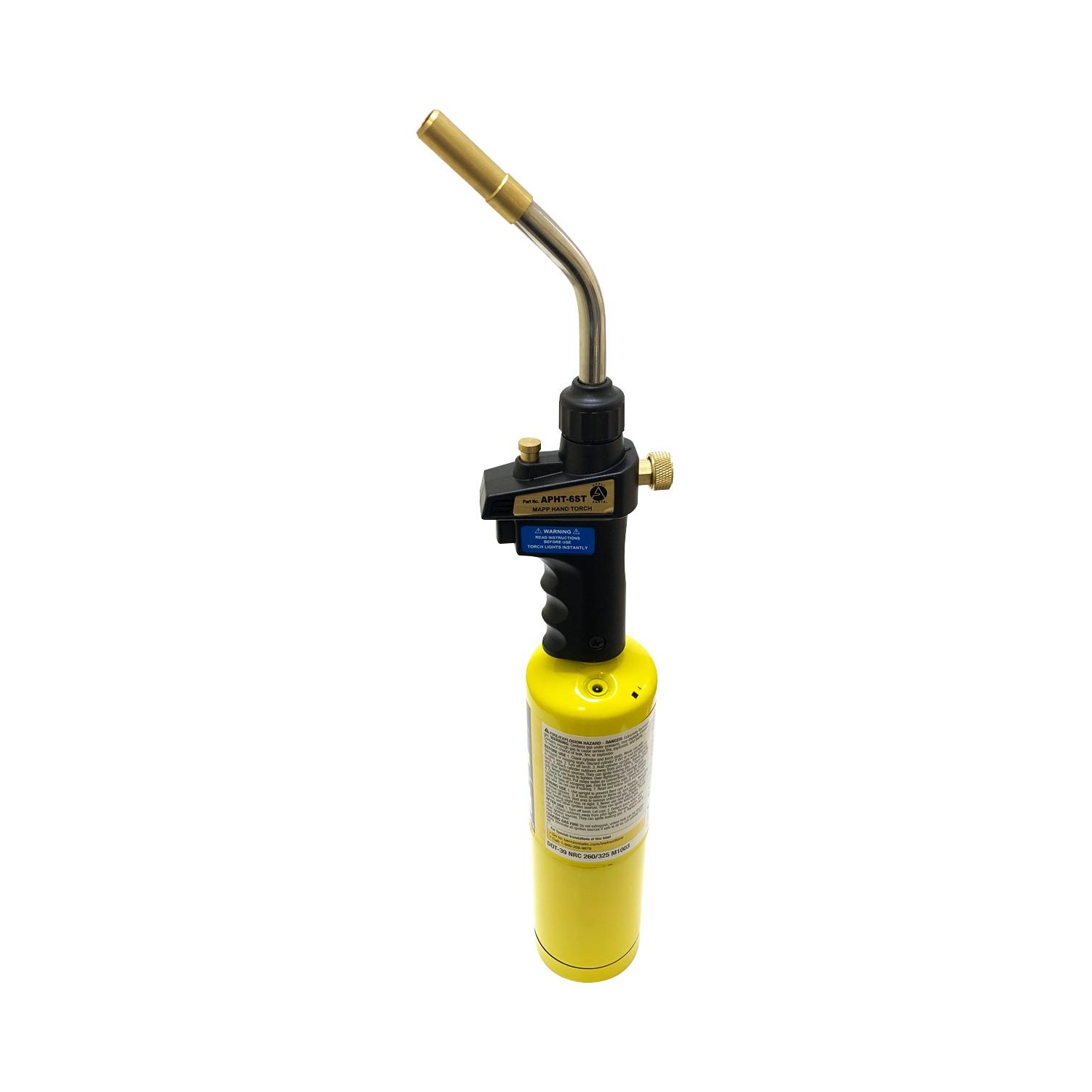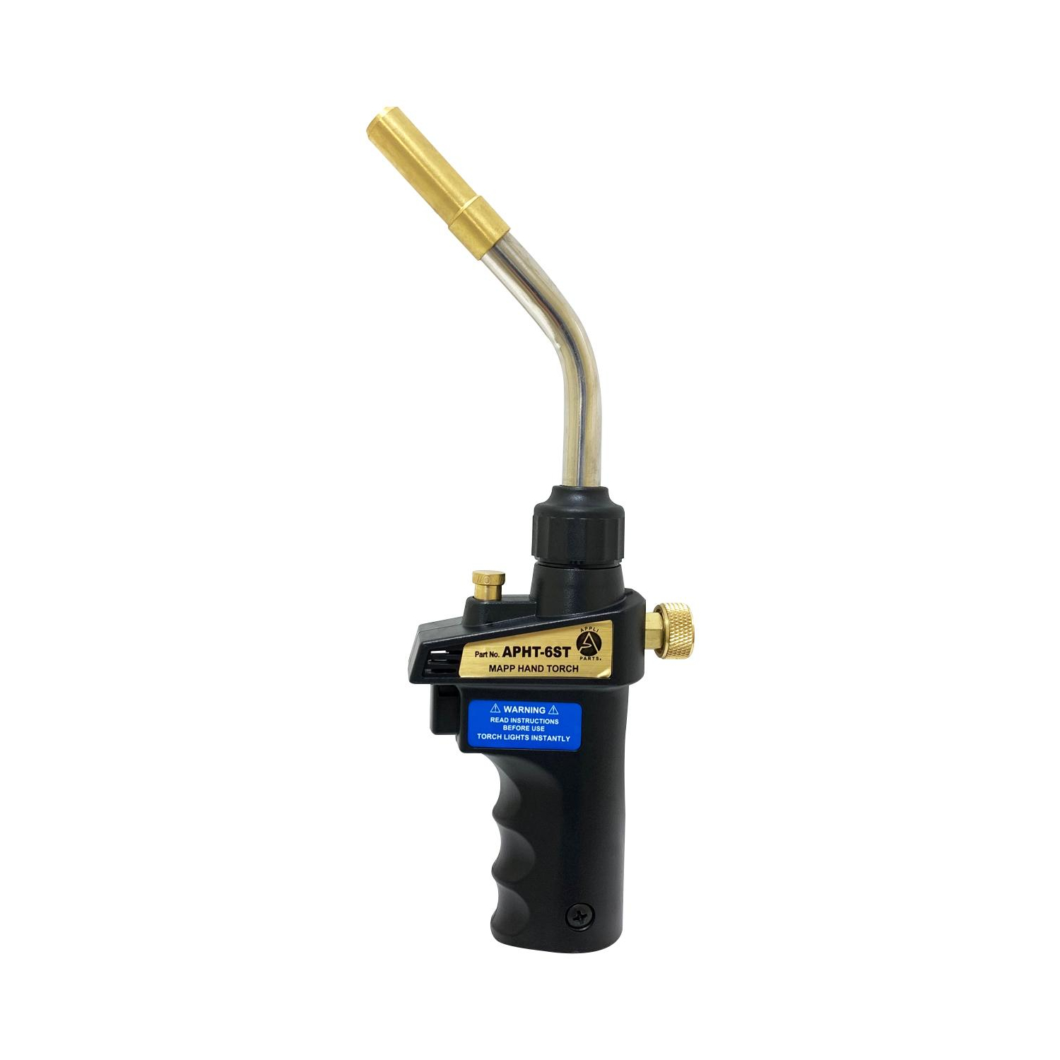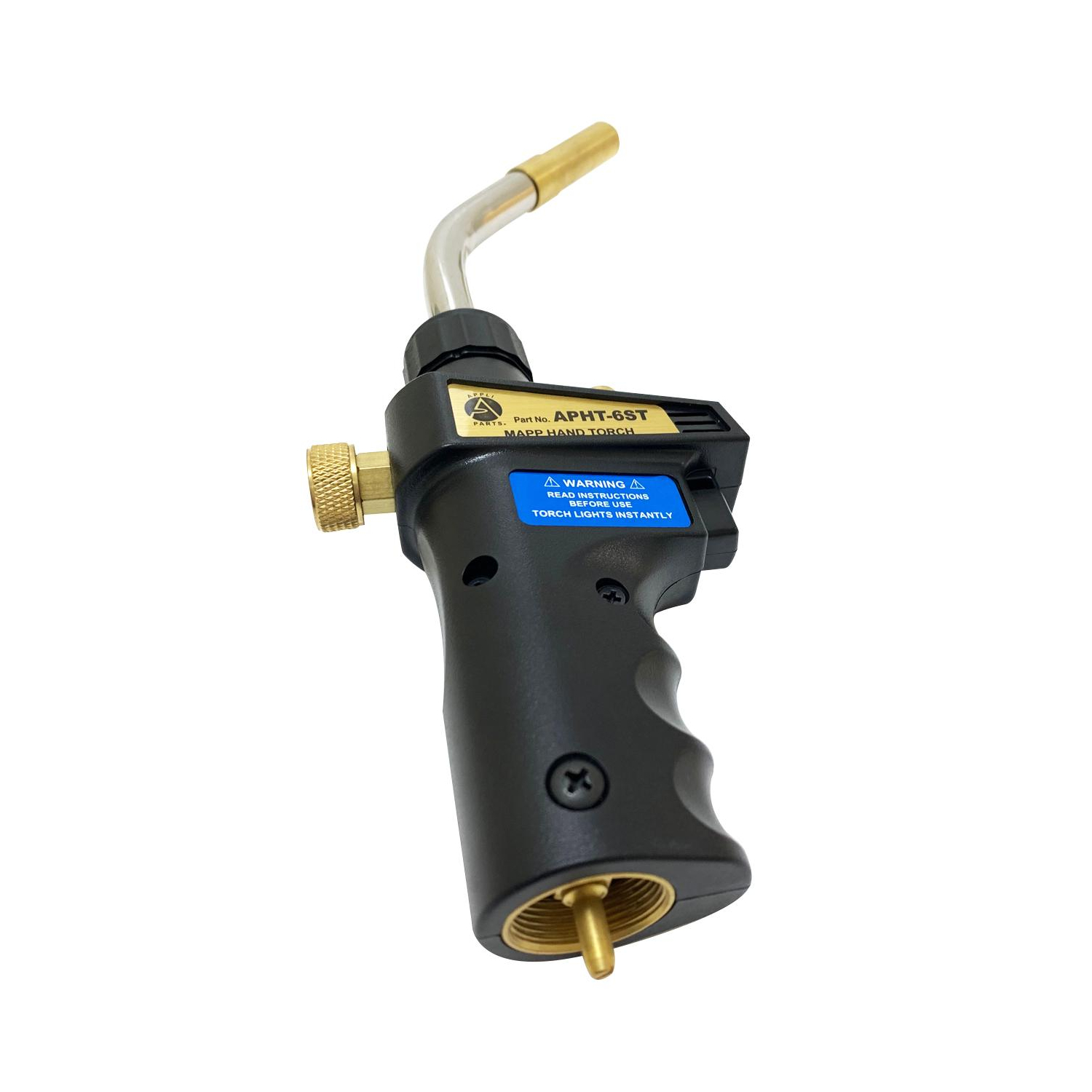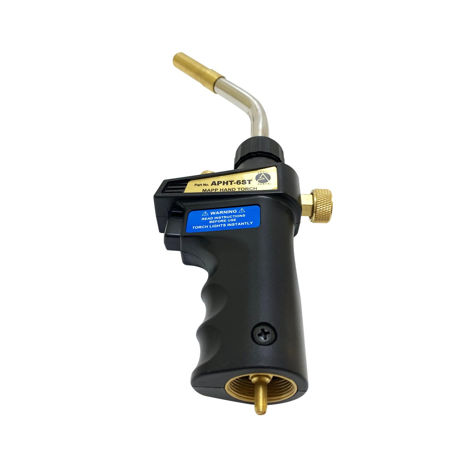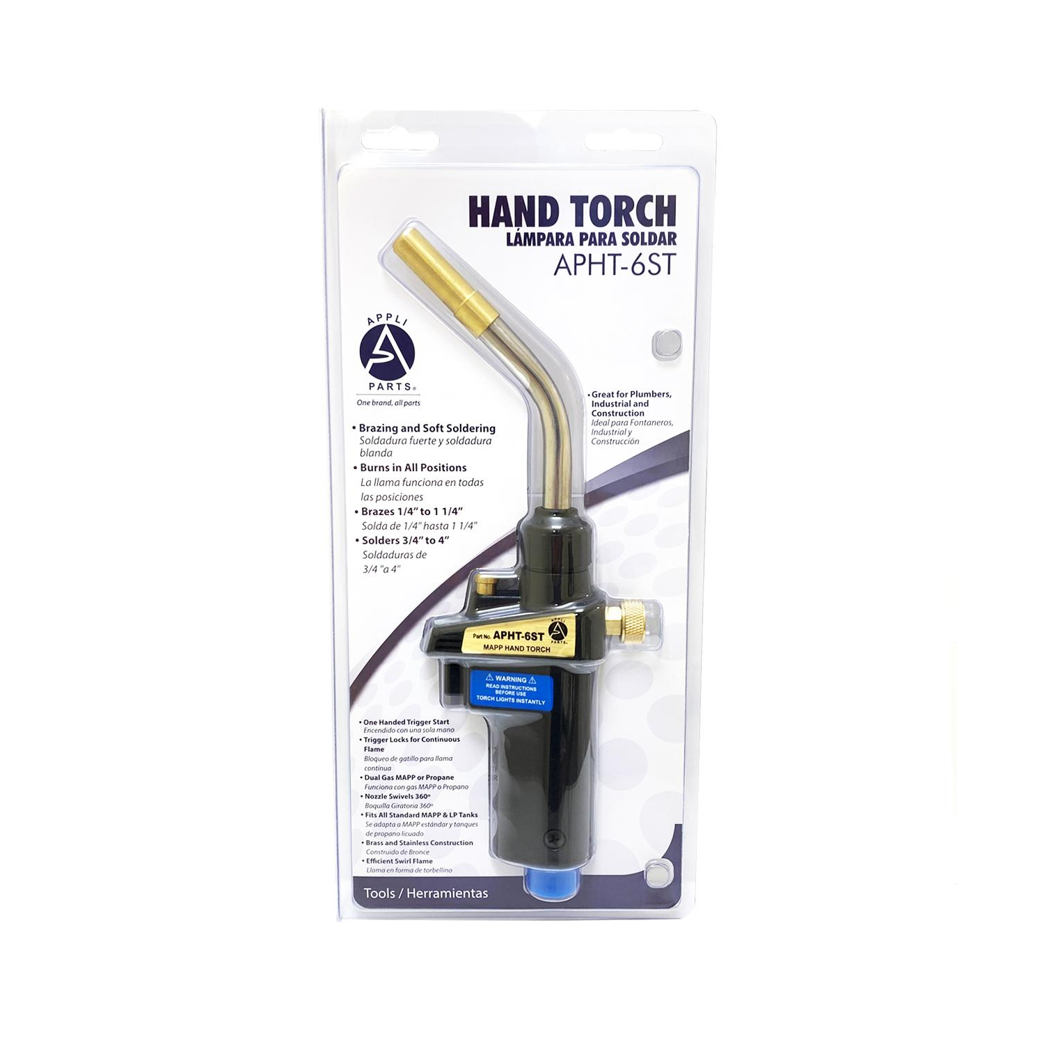 Appli Parts APHT-6ST Single Burner Hand Torch With Lighter and Lock for Soldering, Brazing with Mapp or Propane for plumbing A/A refrigeration and more Construction: Brass body and stainless steel and brass tip Application: Used for copper/brass tube and fittings welding up to 1 In brazing up to 5/8 In Use: For plumbing, refrigeration, air conditioning, electrical, professionals and diy soldering/welding applications. Use with mapp or propane tanks. Adaptable to 14.1 - 16 Oz Specs: Standard connection CGA600, 375 PSI max gas pressure, max temperature 2100F, tip rotation 360 degrees Quality: All our products are designed and manufactured following very strict procedures and high quality standards during their manufacture. An optimal selection of materials is made, combined with research and development procedures, which guarantee the durability and performance of each manufactured product, offering our customers the same efficiency expected from an original part